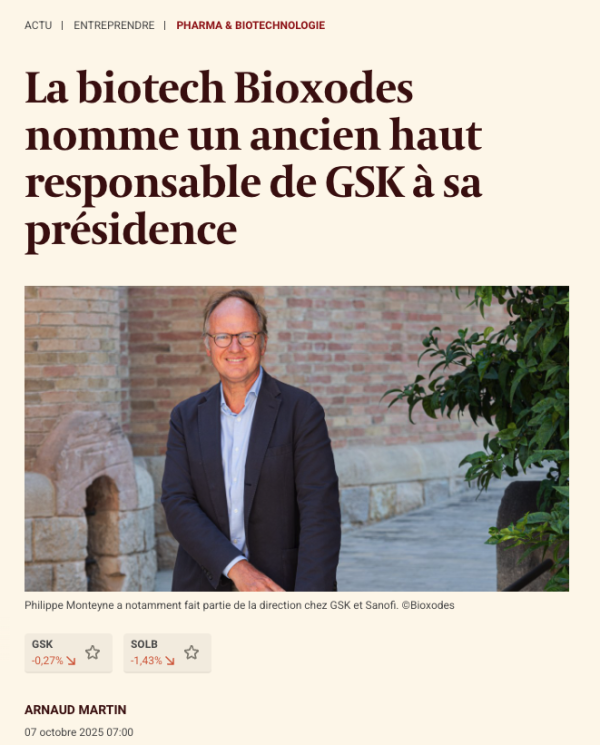 La biotech Bioxodes nomme un ancien haut responsable de GSK à sa présidence