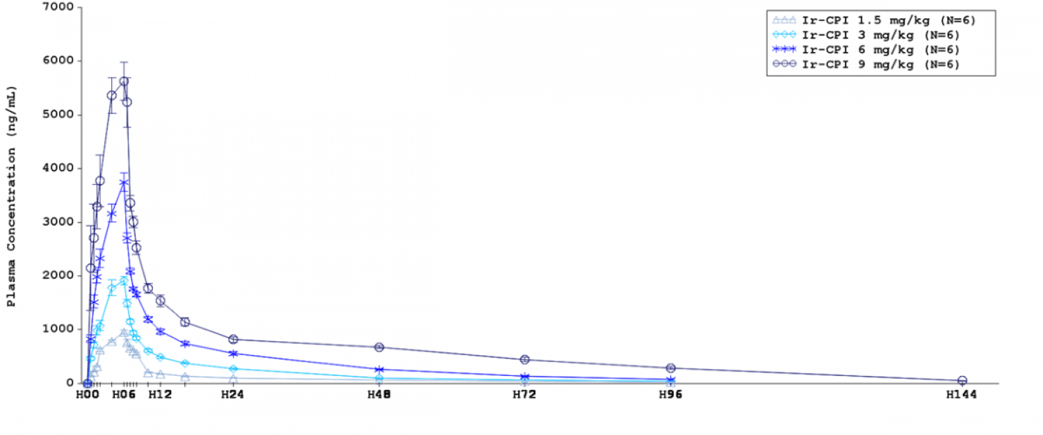 Thirty-two (32) healthy adult male volunteers were enrolled in this trial with a ratio 6-active and 2-placebo per dose level. A total of four dose levels of Ir-CPI ranging from 1.5 mg/kg, 3 mg/kg, 6 mg/kg, up to 9 mg/kg were tested and administered intravenously for a 6-h period of infusion.